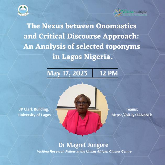 Dr. Magret Jongore, a Visiting Research Fellow from the Bindura University of Science Education, Zimbabwe will deliver a lecture on Wednesday, May 17, 2023 at the Institute of African and Diaspora Studies, University of Lagos, Nigeria. TOPIC: The Nexus between Onomastics and Critical Discourse Approach: An Analysis of selected toponyms in Lagos Nigeria. DATE: MAY 17, 2023. TIME: 12 PM Click here to join the Lecture