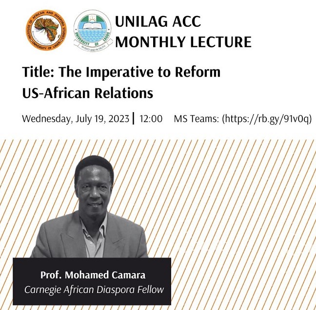 The Unilag African Cluster Centre invites you to her monthly lecture on Wednesday, July 19, 2023. The lecture will be delivered by Professor Mohamed Saliou Camara, a Carnegie African Diaspora Fellow from the Department of African Studies, Howard University, USA. TITLE: THE IMPERATIVE TO REFORM US-AFRICAN RELATIONS. DATE: JULY 19, 2023. TIME: 12 PM  WAT. CLICK HERE TO JOIN THE LECTURE