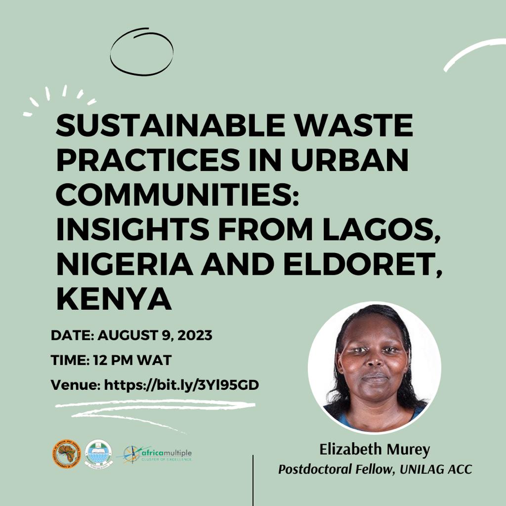 The Unilag African Cluster Centre invites you to a lecture on Wednesday, August 9, 2023. The lecture will be delivered by Dr. Elizabeth Murey, a Postdoctoral Fellow from Moi University, Kenya.   TOPIC: SUSTAINABLE WASTE PRACTICES IN URBAN COMMUNITIES: INSIGHTS FROM LAGOS, NIGERIA AND ELDORET, KENYA. DATE: AUGUST 9, 2023. TIME: 12 PM WAT Click here to join the Lecture
