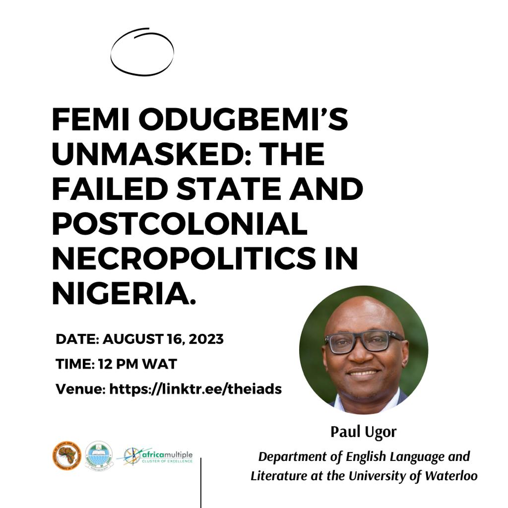 The University of Lagos African Cluster Centre is inviting you to a lecture on Wednesday, August 16, 2023. This will be delivered by Prof. Paul Ugor, a Carnegie African Diaspora Fellow from the Department of English Language and Literature at the University of Waterloo, Ontario, Canada.     TOPIC: FEMI ODUGBEMI’S UNMASKED: THE FAILED STATE AND POSTCOLONIAL NECROPOLITICS IN NIGERIA. DATE: AUGUST 16, 2023. TIME: 12 PM.   Click here to join the lecture