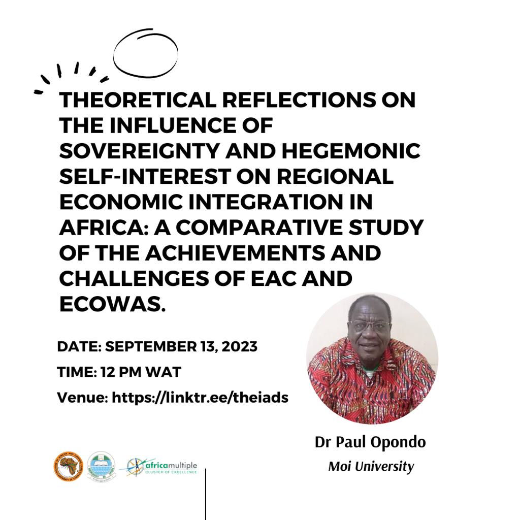 Dr. Paul Opondo, a Visiting Senior Research Fellow at the Unilag African Cluster Centre, Institute of African and Diaspora Studies, will deliver a public lecture on Wednesday, September 13, 2023, at 12 noon Nigeria Time.   TOPIC: Theoretical Reflections on the Influence of Sovereignty and Hegemonic Self-interest on Regional Economic          Integration in Africa: A Comparative Study of the Achievements and Challenges of EAC and ECOWAS. DATE: September 13, 2023. TIME: 12 PM WAT. Click here to join the Lecture