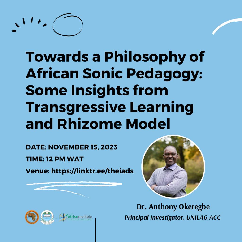 Dr. Anthony Okeregbe will deliver a lecture on Wednesday, November 15, 2023 at the Institute of African and Diaspora Studies, University of Lagos. TOPIC: Towards a Philosophy of African Sonic Pedagogy: Some Insights from Transgressive Learning and Deleuze-Guattarian Rhizome Model DATE: November 15, 2023. TIME: 12 PM Click here to join the Lecture