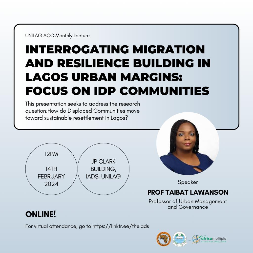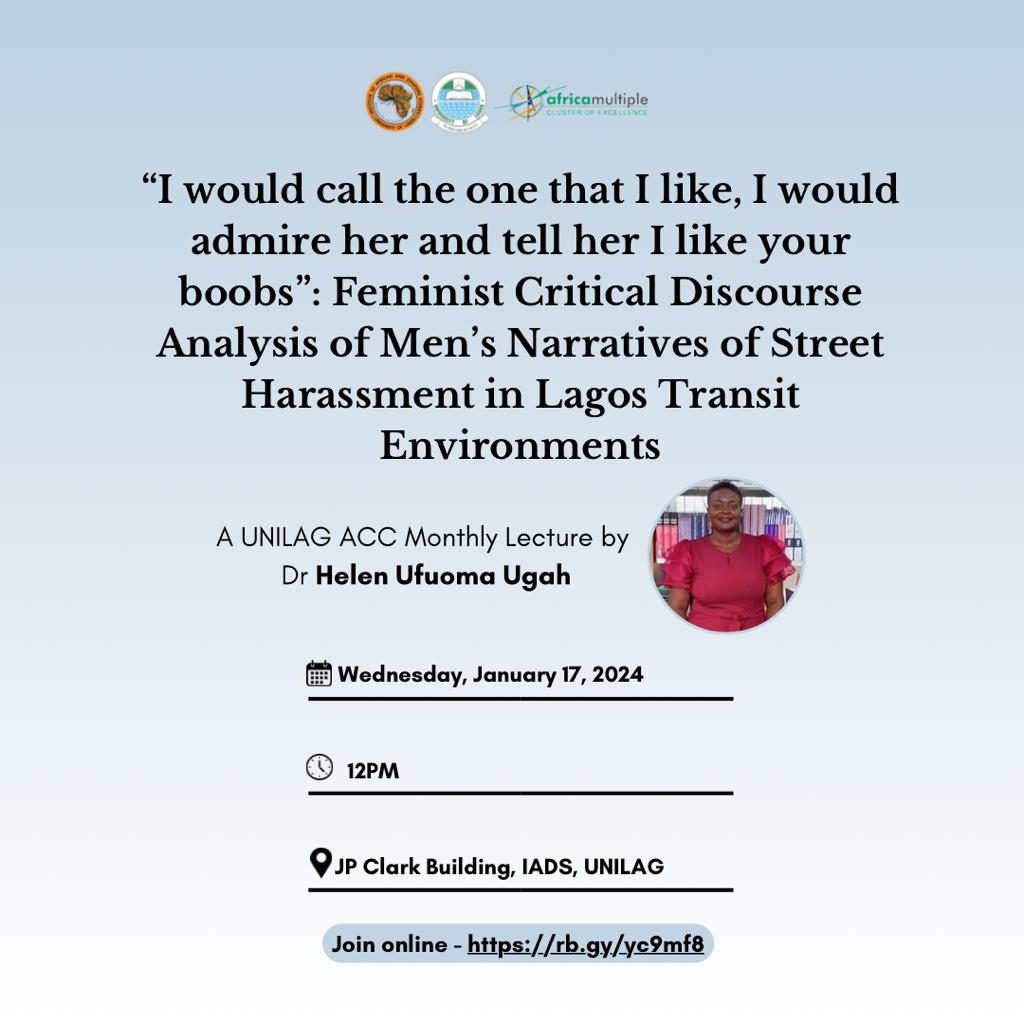 The UNILAG ACC invites you to a lecture that will be delivered by Dr. Abisoye Eleshin on Wednesday, October 18, 2023 at the Institute of African and Diaspora Studies, University of Lagos. TOPIC: Sociocultural Perspective to Individual Name Change and (Re)construction of Identity in Lagos. TIME: 12 PM (Nigeria Time) DATE: 18TH OCTOBER, 2023 Click here to join the lecture