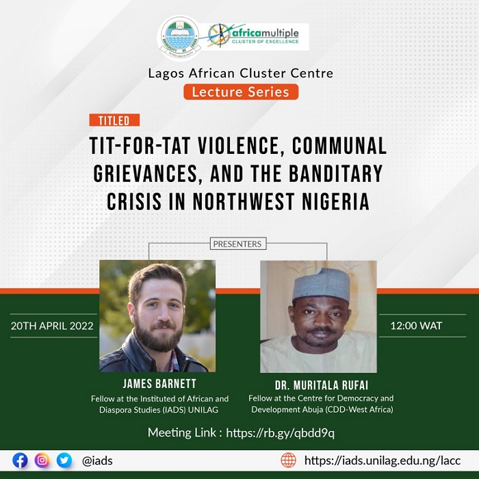 Dr. Murtala Rufa’i, a research consultant with West African Network for Peacebuilding (WANEP), the European Union, and the United Nations Development Programme (UNDP) and James Barnett, a visiting research fellow at the Institute of African and Diaspora Studies will deliver a Lecture on Wednesday, April 20, 2022. Time is 12 PM Nigeria Time.   Please click to join the Lecture