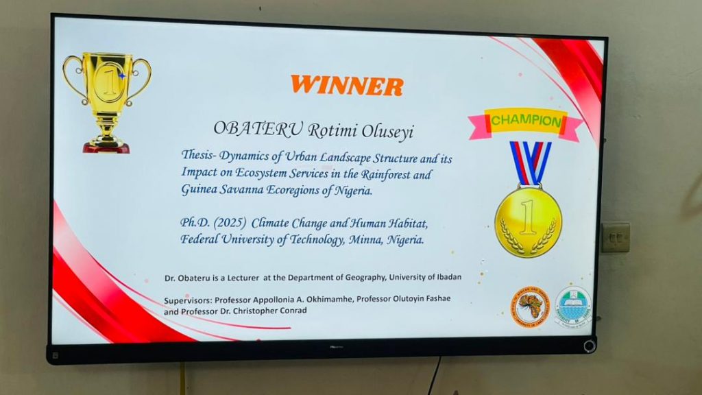 On Monday, November 24, 2025, the Director, Institute of African and Diaspora Studies, University of Lagos announced the winner of the prestigious Rahamon Bello award. Dr Oluseyi Rotimi Obateru, Lecturer, Department of Geography, University of Ibadan in Oyo, emerged the winner of 2025 Rahamon Bello award for best Ph.D thesis in African and Diaspora Studies. His thesis entitled: “Dynamics of Urban Landscape Structure and its Impact on Ecosystem Services in the Rainforest and Guinea Savanna Ecoregions of Nigeria”. The Ph.D was obtained from the Federal University of Technology Minna in Niger State, Nigeria. Dr. Obateru’s thesis was supervised by Professors Apollonia Okhimamhe, Olutoyin Fashae and Dr Christopher Conrad.
